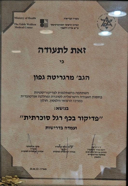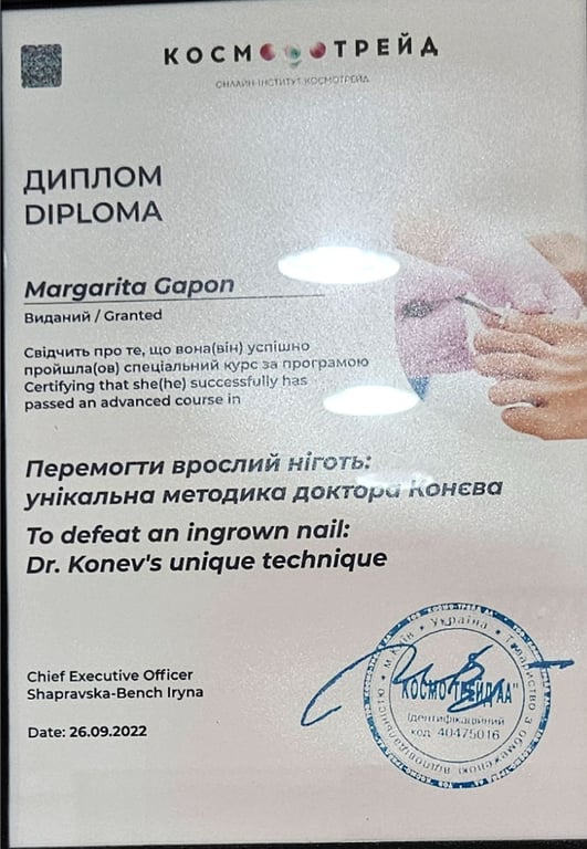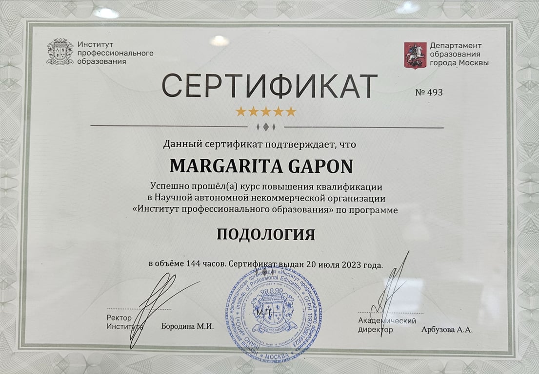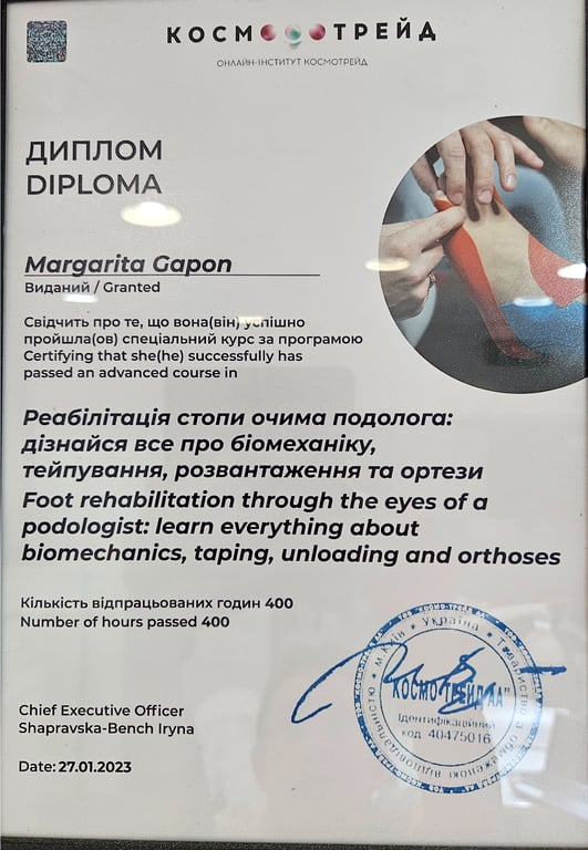 אני עוסקת בתחום משנת 2019, עם הכשרה מקיפה ממוסדות מובילים: בוגרת האוניברסיטה להכשרה מקצועית במוסקבה, בעלת הסמכה בשיטות Dr. Konev לטיפול בציפורן חודרנית ושיקום כף הרגל, ובוגרת קורסים מתקדמים לטיפול בכף רגל סוכרתית – בשיתוף עמותת חולי הסוכרת ובית החולים וולפסון. כיום אני ממשיכה את לימודיי בבית הספר הגרמני לפודולוגיה ב BONA, כחלק מתוכנית קלינית לצד צוותים רפואיים.