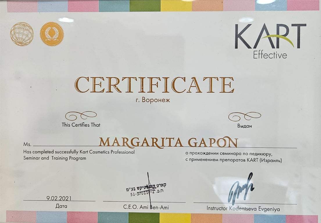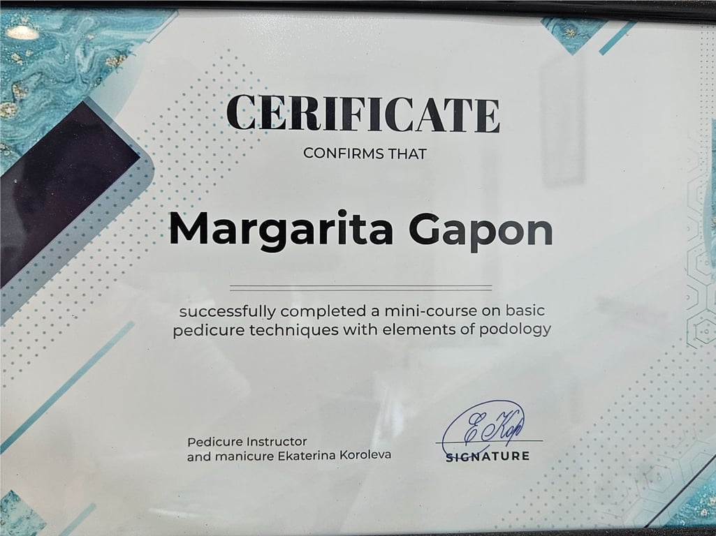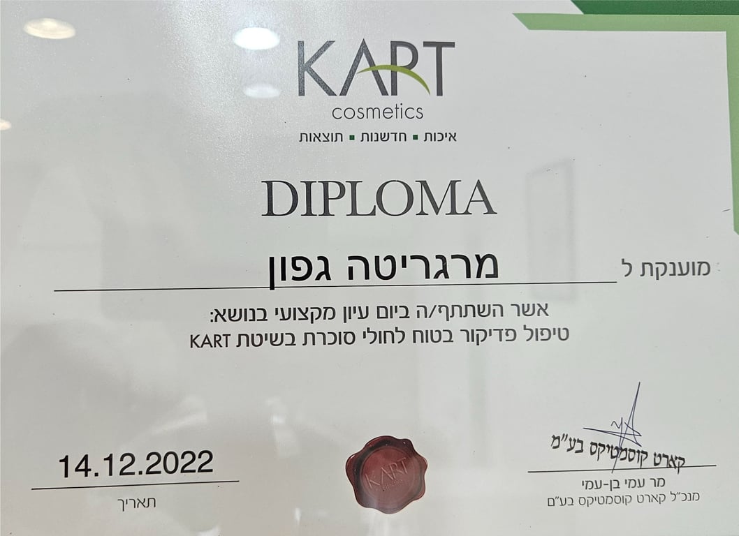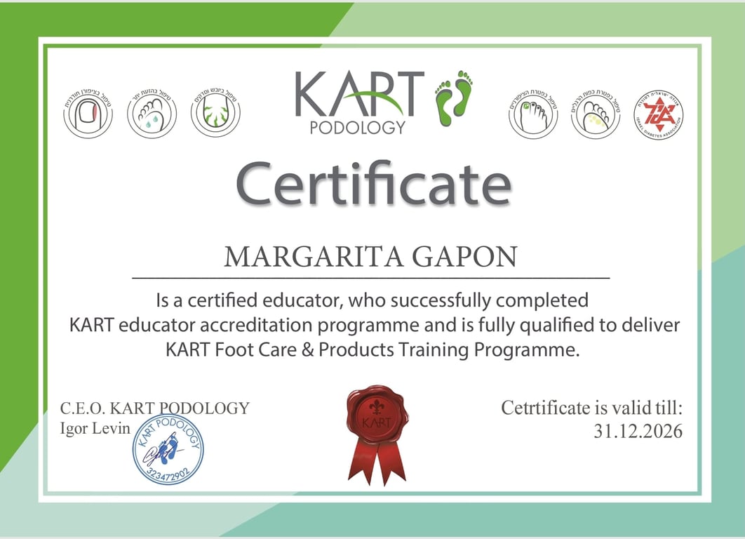 שמי מרגריטה גפון, פדיקוריסטית מוסמכת עם ידע בפודולוגייה, מומחית לפדיקור קוסמטי ורפואי, ומדריכת חברת KART בישראל. אני הבעלים של Professional Pedicure Clinic באילת, ושותפה ב-Professional Pedicure Clinic & Academy – מרכז לטיפול ולהדרכה מקצועית בתחומי הפדיקור והפודולוגיה.